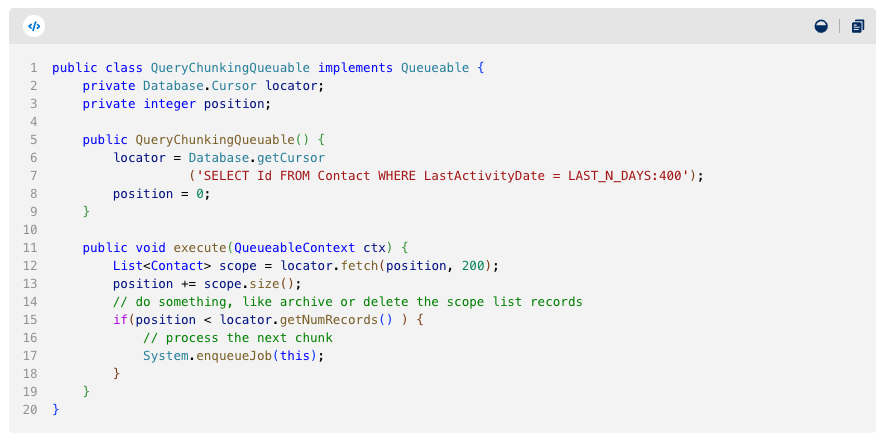 Why It Matters: The cursor-based approach with fetchPage(start, pageSize) replaces LIMIT/OFFSET patterns that frequently hit governor limits and create performance bottlenecks with large datasets.